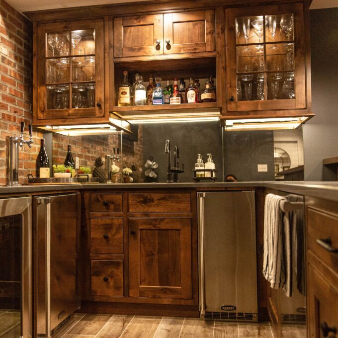 Our Bar Cabinetry portfolio is a showcase of our craftsmanship and functional design. A space meant to enhance your home’s aesthetics and reflect your personal style. Maybe it’s sleek shelving integrated into the design, stocked with your favorite bourbon backlit with custom lighting. At Laslo, the possibilities are endless, and your vision is our inspiration. We embrace collaborative design with our customers to ensure our design reflects your wishes. Our designers and craftsmen take all your requirements into consideration and then bring your vision to life. Explore our bar cabinetry portfolio today for design inspiration for your very own home bar.