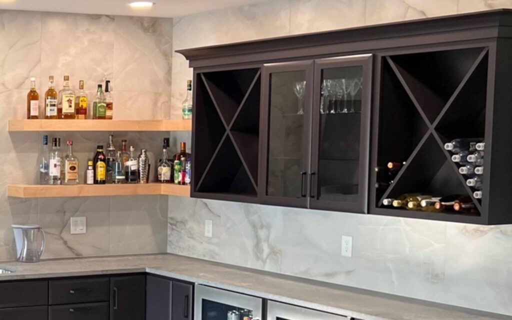 - Floating shelves that make it easy to grab a rocks glass, wine glass, or tumbler mid-pour