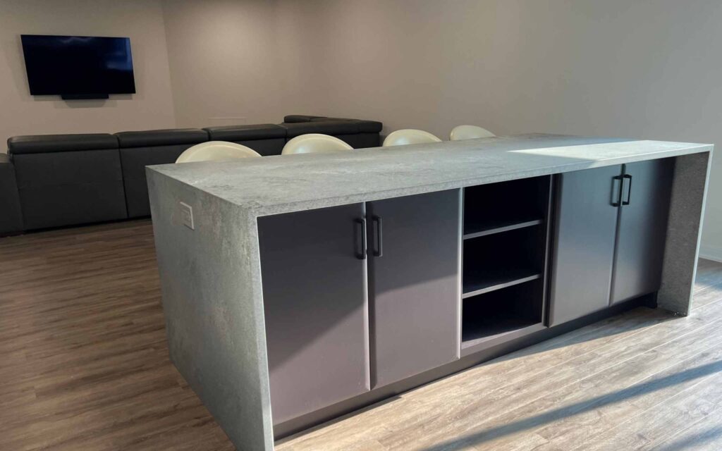 - Caesarstone Rugged Concrete – countertop material supplied by Eastern Surfaces
