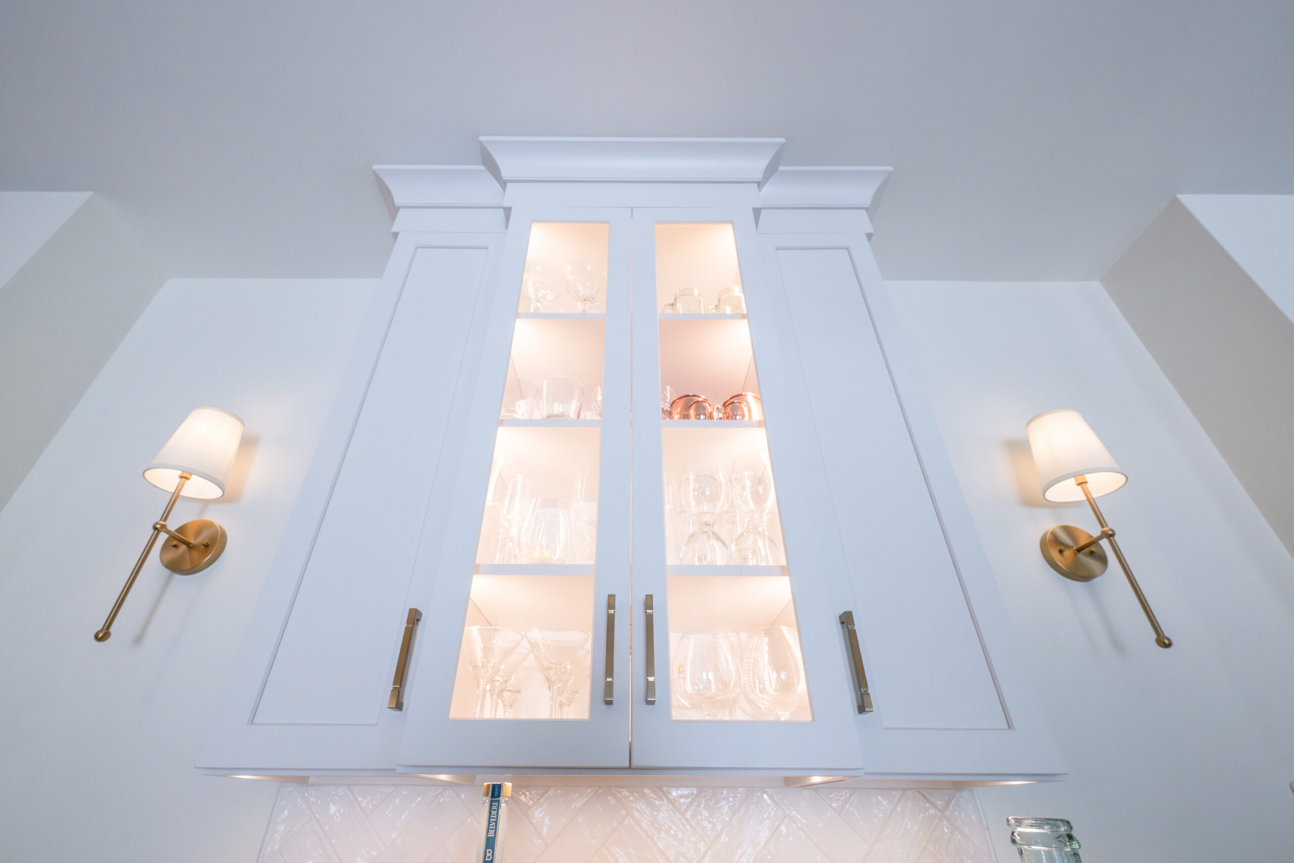 Tucked along the perimeter, this beverage nook turns a simple cabinet run into a welcoming bar station that invites quick cocktails or morning pour-overs. Linen White maple cabinets with clear glass doors showcase glassware and bottles under soft LED lighting that highlights every detail without glare. The Hudson-style doors maintain the cohesive look, while the open lower shelf accommodates a wooden tray for mixers, adding to the cottage vibe.