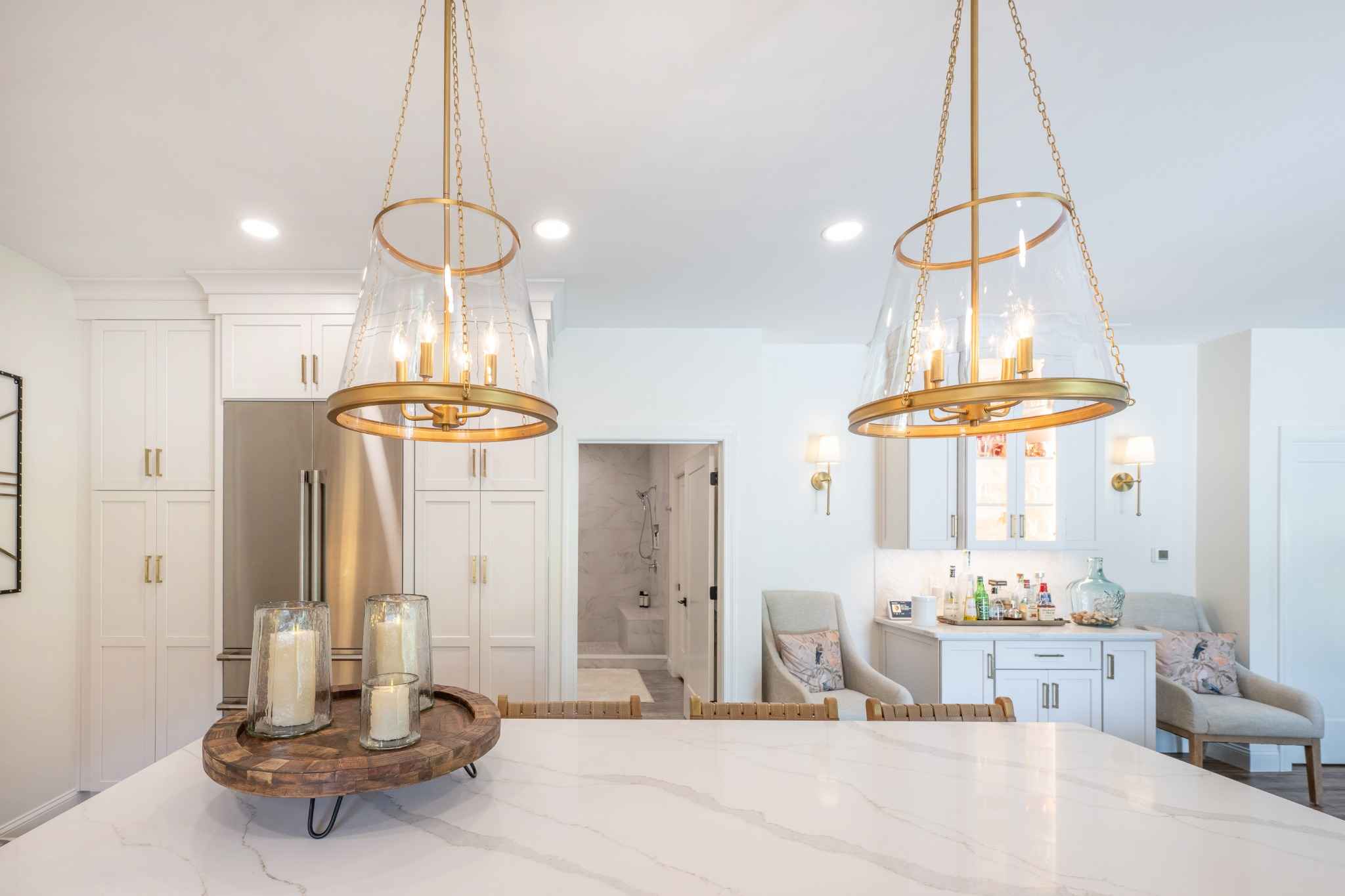 - Lighting: Brass pendants with seeded glass globes, undercabinet task lighting