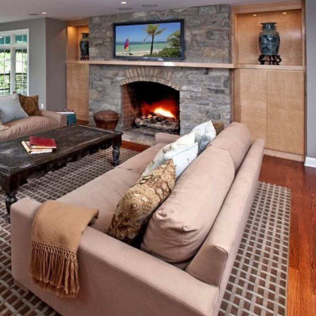 Maple’s appeal extends beyond the kitchen. Birdseye maple built-ins surround a stone fireplace, adding light, refinement, and texture to the living area. The wood’s soft grain draws the eye without overpowering the space.