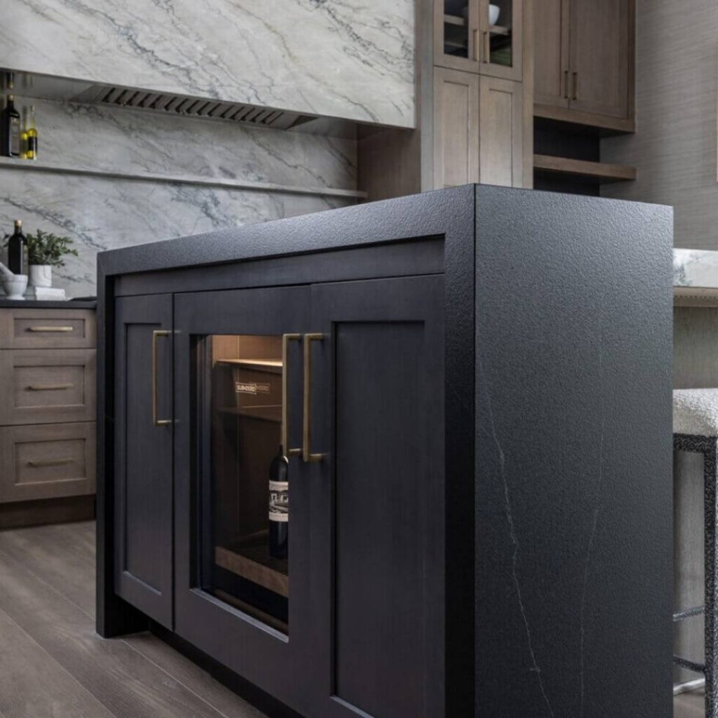 This kitchen is made for both style and comfort by mixing earthy wood tones natural textures. Dura Supreme Cabinetry’s Bria cabinets in the Carson style and the Morel stain finish are used for the primary perimeter cabinets. The Onyx stain on Maple adds an extra pop, giving the kitchen a cool modern vibe with a classic touch.