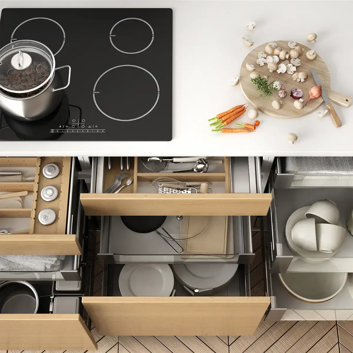 • Specialty storage solutions (pull-outs, pantry towers, drawer organizers)